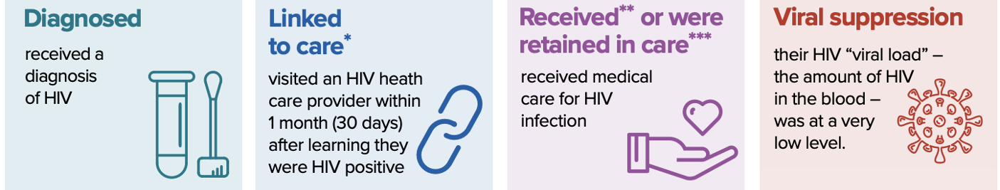 The HIV care continuum is a public health model that outlines the steps or stages that people with HIV go through from diagnosis to achieving and maintaining viral suppression (a very low or undetectable amount of HIV in the body).